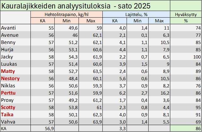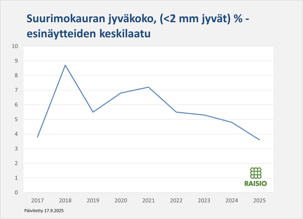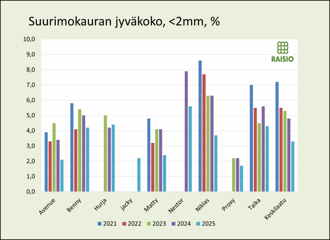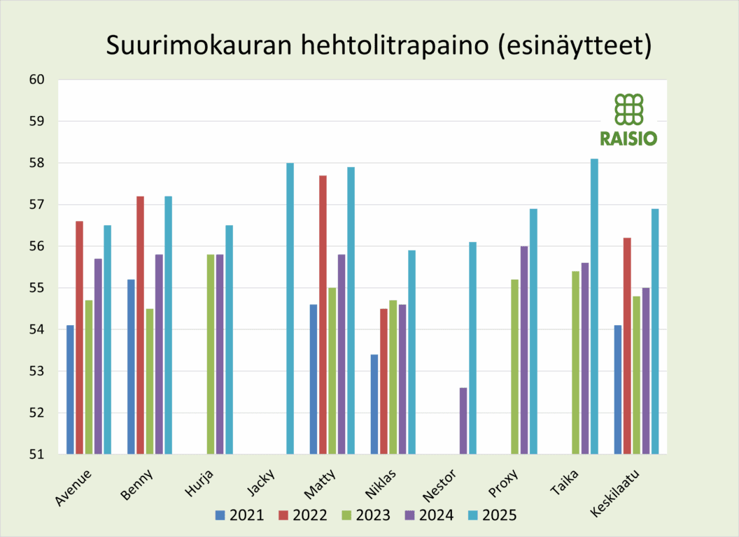Kauralajikkeiden vaihtuvuus on melko suurta ja se näkyy myös Raisioon toimitettujen erien jakaumassa. Toisaalta laatuerot ovat lajikkeiden välillä melko pienet, koska olosuhteet olivat kauran kasvua suosivia.