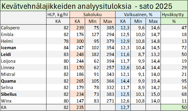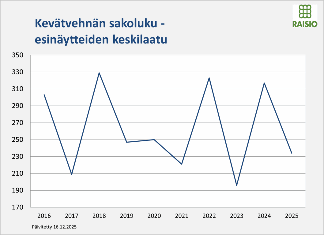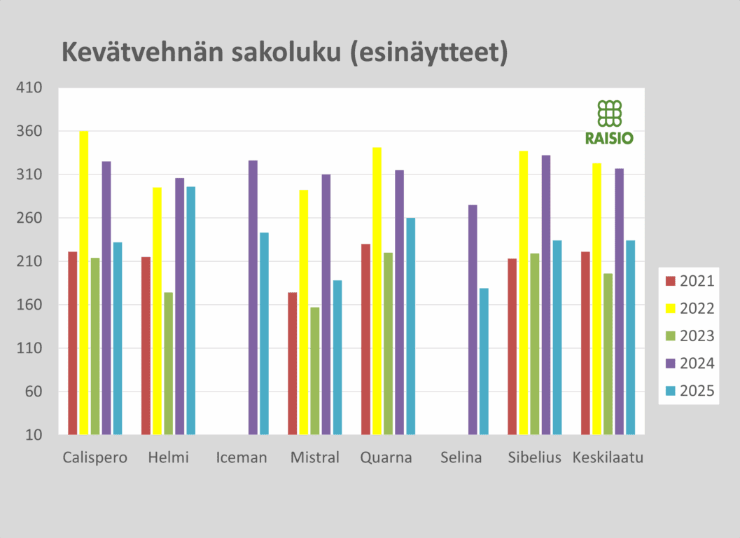 Syysvehnän keskisato on Luken tilaston mukaan Varsinais-Suomessa 5350 kg/ha. Raisioon toimitettujen esinäytteiden keskivalkuaispitoisuus on 11,6 % ja sakoluku 360.