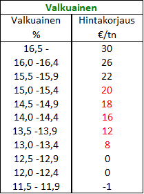 Olemme päivittäneet vehnän valkuaishinnoittelua nostamalla laatuhyvitystä valkuaispitoisuuden ollessa 13,0-15,4 %. Muutos astuu voimaan heti ja koskee myös satoa 2026.